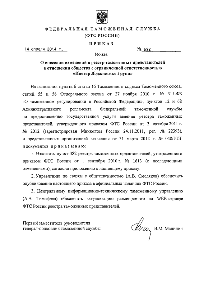 ПРИКАЗ ФТС РФ от 14.04.2014 N 692