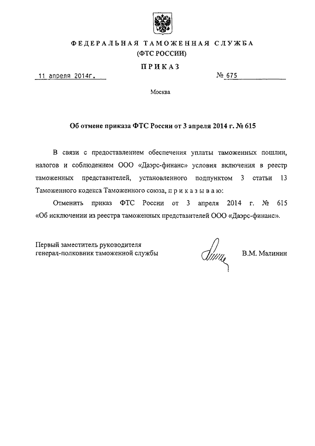 ПРИКАЗ ФТС РФ от 11.04.2014 N 675