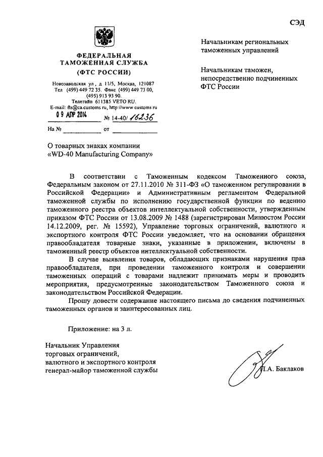 ПИСЬМО ФТС РФ от 09.04.2014 N 14-40/16236