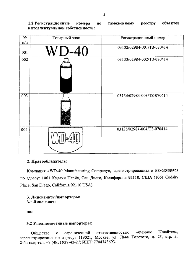 "О ТОВАРНЫХ ЗНАКАХ КОМПАНИИ "WD-40 MANUFACTURING COMPANY"