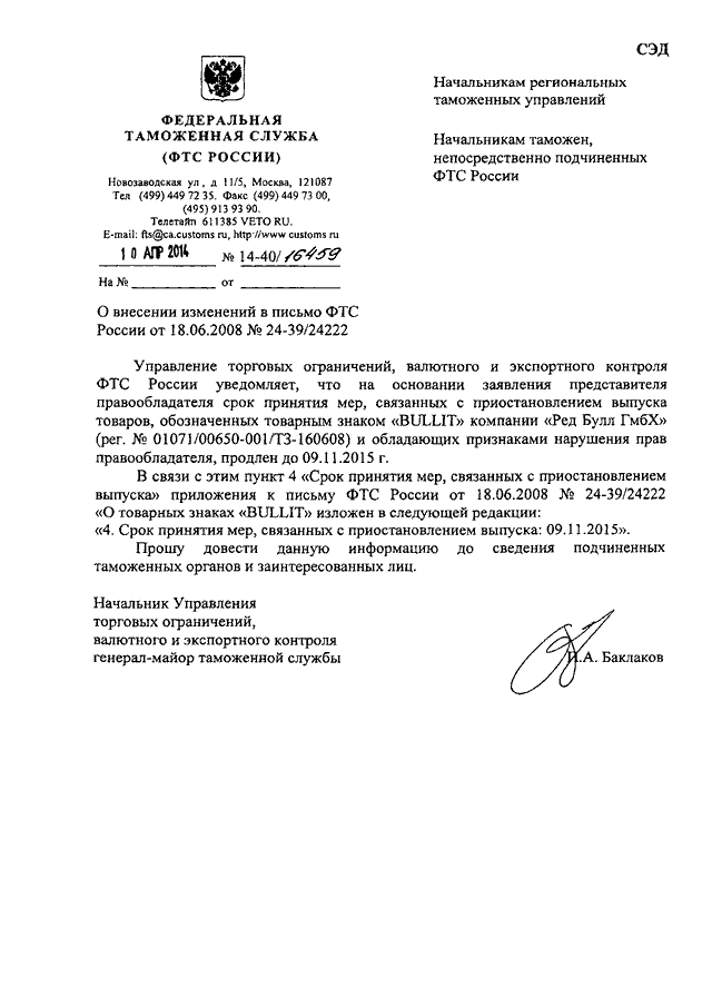 ПИСЬМО ФТС РФ от 10.04.2014 N 14-40/16459