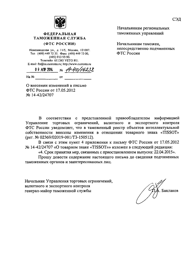 ПИСЬМО ФТС РФ от 09.04.2014 N 14-40/16238