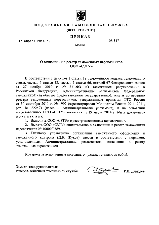 ПРИКАЗ ФТС РФ от 17.04.2014 N 717