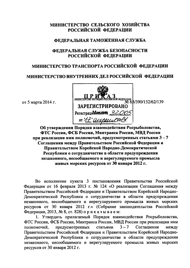"ОБ УТВЕРЖДЕНИИ ПОРЯДКА ВЗАИМОДЕЙСТВИЯ РОСРЫБОЛОВСТВА, ФТС РОССИИ, ФСБ РОССИИ, МИНТРАНСА РОССИИ, МВД РОССИИ ПРИ РЕАЛИЗАЦИИ ИМИ ПОЛНОМОЧИЙ, ПРЕДУСМОТРЕННЫХ СТАТЬЯМИ 3 - 7 СОГЛАШЕНИЯ МЕЖДУ ПРАВИТЕЛЬСТВОМ РОССИЙСКОЙ ФЕДЕРАЦИИ И ПРАВИТЕЛЬСТВОМ КОРЕЙСКОЙ НАРОДНО - ДЕМОКРАТИЧЕСКОЙ РЕСПУБЛИКИ О СОТРУДНИЧЕСТВЕ В ОБЛАСТИ ПРЕДУПРЕЖДЕНИЯ НЕЗАКОННОГО, НЕСООБЩАЕМОГО И НЕРЕГУЛИРУЕМОГО ПРОМЫСЛА ЖИВЫХ МОРСКИХ РЕСУРСОВ ОТ 30 ЯНВАРЯ 2012 Г."