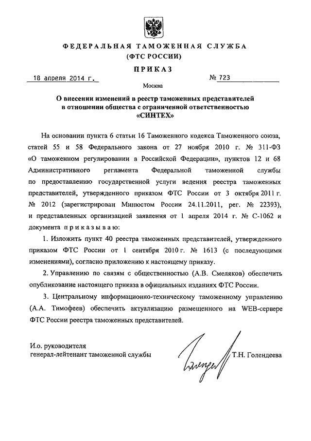 ПРИКАЗ ФТС РФ от 18.04.2014 N 723