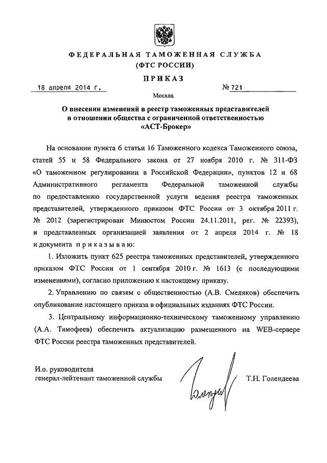 ПРИКАЗ ФТС РФ от 18.04.2014 N 721