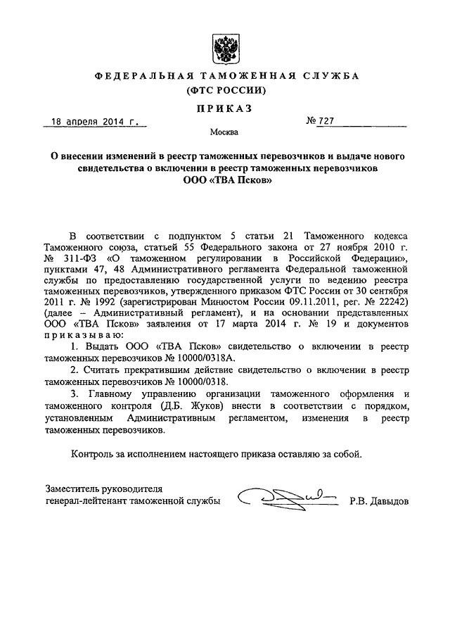 "О ВНЕСЕНИИ ИЗМЕНЕНИЙ В РЕЕСТР ТАМОЖЕННЫХ ПЕРЕВОЗЧИКОВ И ВЫДАЧЕ НОВОГО СВИДЕТЕЛЬСТВА О ВКЛЮЧЕНИИ В РЕЕСТР ТАМОЖЕННЫХ ПЕРЕВОЗЧИКОВ ООО "ТВА ПСКОВ"