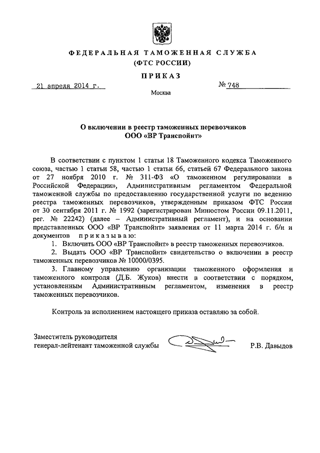 ПРИКАЗ ФТС РФ от 21.04.2014 N 748