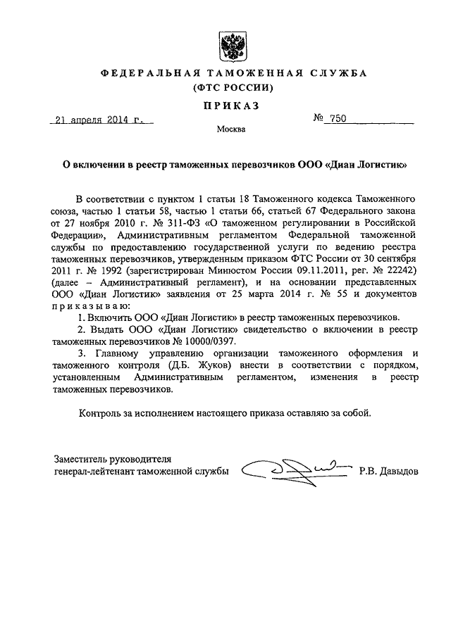 "О ВКЛЮЧЕНИИ В РЕЕСТР ТАМОЖЕННЫХ ПЕРЕВОЗЧИКОВ ООО "ДИАН ЛОГИСТИК"