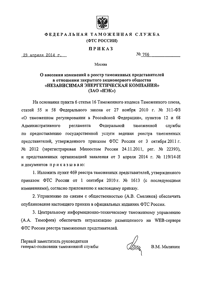 ПРИКАЗ ФТС РФ от 23.04.2014 N 766