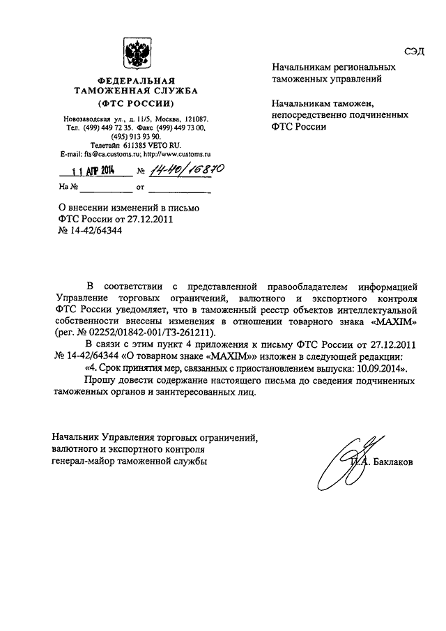 ПИСЬМО ФТС РФ от 11.04.2014 N 14-40/16870
