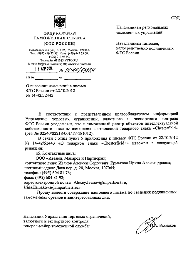 ПИСЬМО ФТС РФ от 15.04.2014 N 14-40/17284