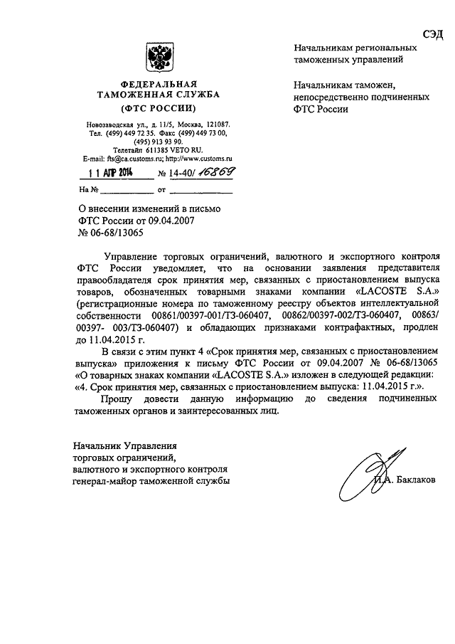 ПИСЬМО ФТС РФ от 11.04.2014 N 14-40/16869