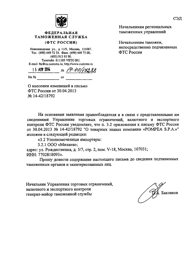 "О ВНЕСЕНИИ ИЗМЕНЕНИЙ В ПИСЬМО ФТС РОССИИ ОТ 30.04.2013 N 14-42/18792"
