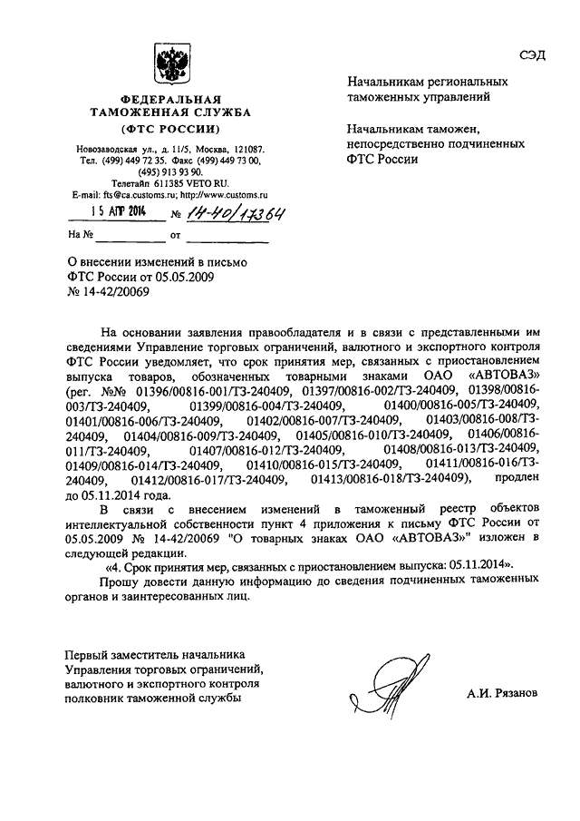 ПИСЬМО ФТС РФ от 15.04.2014 N 14-40/17364