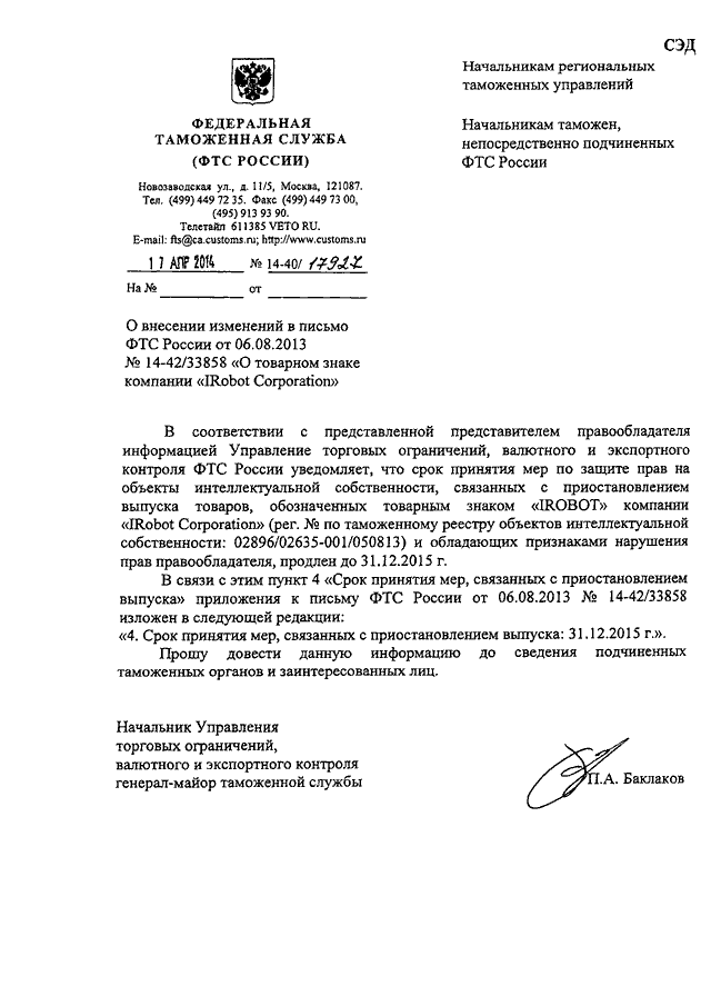 "О ВНЕСЕНИИ ИЗМЕНЕНИЙ В ПИСЬМО ФТС РОССИИ ОТ 06.08.2013 N 14-42/33858 "О ТОВАРНОМ ЗНАКЕ КОМПАНИИ "IROBOT CORPORATION"