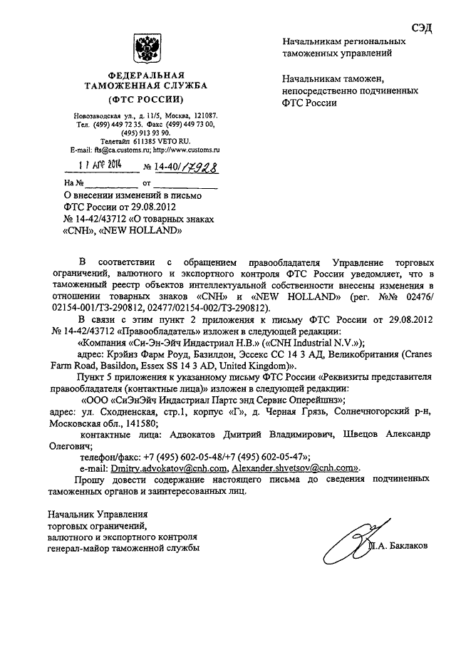 "О ВНЕСЕНИИ ИЗМЕНЕНИЙ В ПИСЬМО ФТС РОССИИ ОТ 29.08.2012 N 14-42/43712 "О ТОВАРНЫХ ЗНАКАХ "CNH", "NEW HOLLAND"