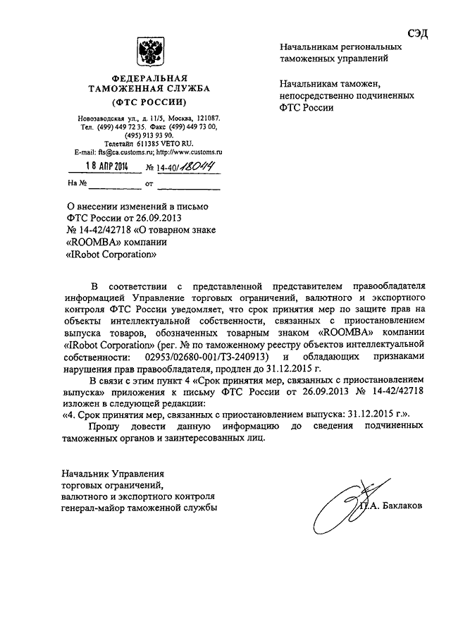 "О ВНЕСЕНИИ ИЗМЕНЕНИЙ В ПИСЬМО ФТС РОССИИ ОТ 26.09.2013 N 14-42/42718 "О ТОВАРНОМ ЗНАКЕ "ROOMBA" КОМПАНИИ "IROBOT CORPORATION"