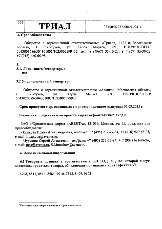 "О ТОВАРНЫХ ЗНАКАХ ООО "ТРИАЛ"