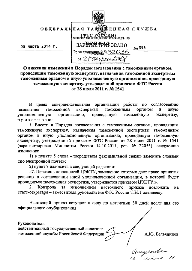 ПРИКАЗ ФТС РФ от 05.03.2014 N 396 "О ВНЕСЕНИИ ИЗМЕНЕНИЙ В ПОРЯДОК СОГЛАСОВАНИЯ С ТАМОЖЕННЫМ ОРГАНОМ,