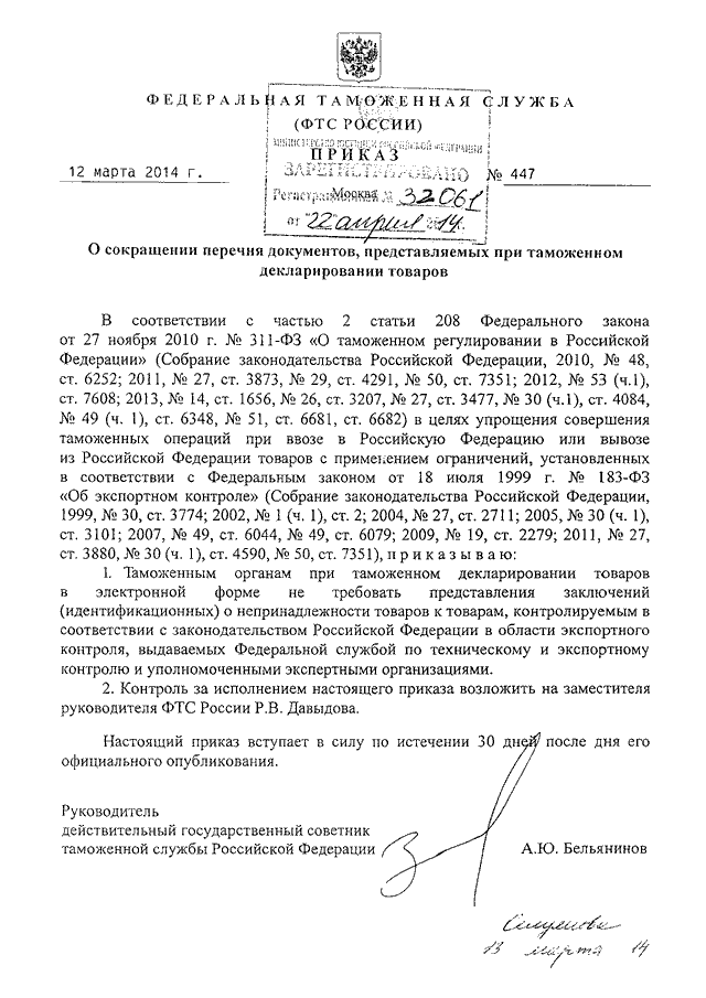ПРИКАЗ ФТС РФ от 12.03.2014 N 447