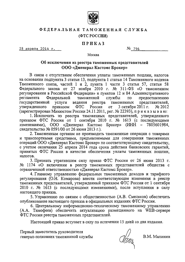 ПРИКАЗ ФТС РФ от 28.04.2014 N 796