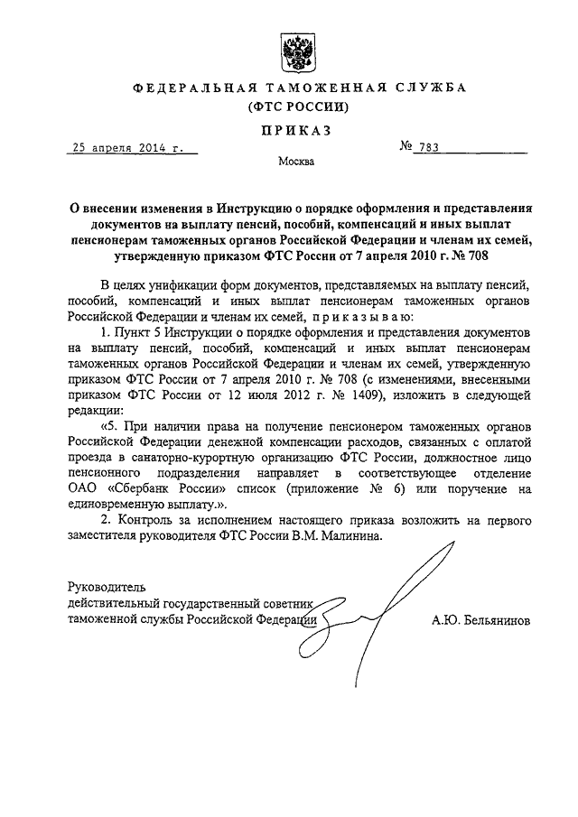ПРИКАЗ ФТС РФ от 25.04.2014 N 783 "О ВНЕСЕНИИ ИЗМЕНЕНИЯ В ИНСТРУКЦИЮ О ПОРЯДКЕ ОФОРМЛЕНИЯ И