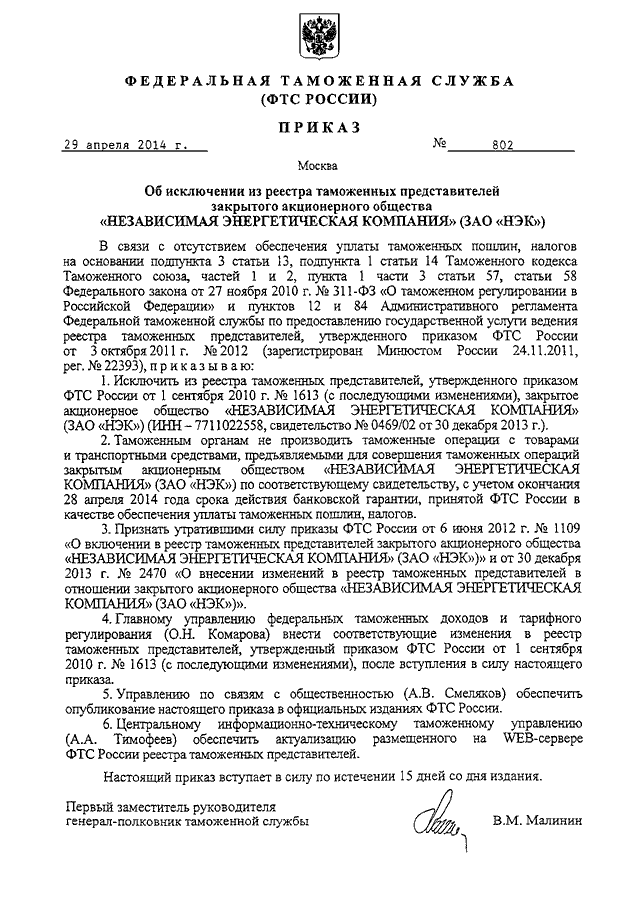 "ОБ ИСКЛЮЧЕНИИ ИЗ РЕЕСТРА ТАМОЖЕННЫХ ПРЕДСТАВИТЕЛЕЙ ЗАКРЫТОГО АКЦИОНЕРНОГО ОБЩЕСТВА "НЕЗАВИСИМАЯ ЭНЕРГЕТИЧЕСКАЯ КОМПАНИЯ" (ЗАО "НЭК")"