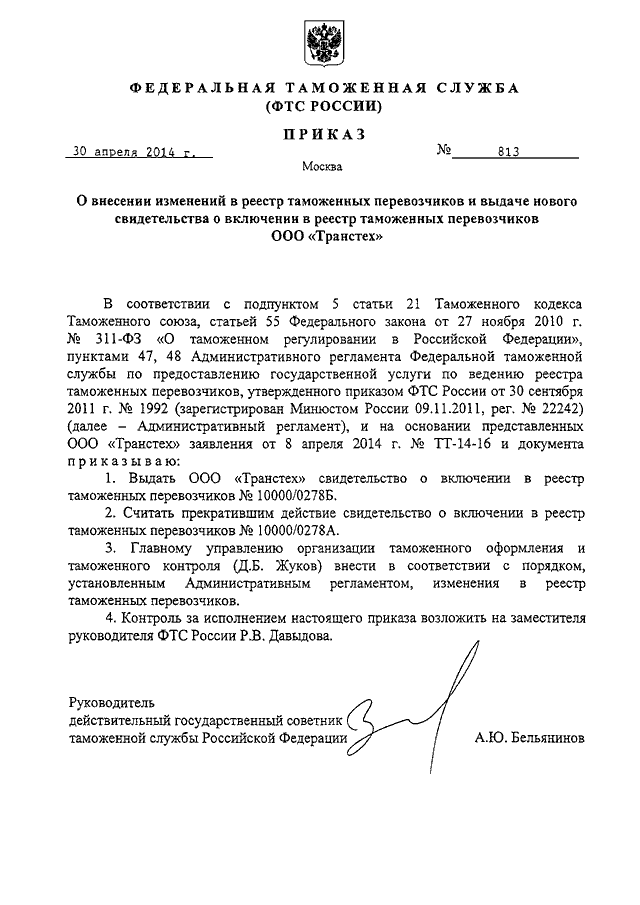 "О ВНЕСЕНИИ ИЗМЕНЕНИЙ В РЕЕСТР ТАМОЖЕННЫХ ПЕРЕВОЗЧИКОВ И ВЫДАЧЕ НОВОГО СВИДЕТЕЛЬСТВА О ВКЛЮЧЕНИИ В РЕЕСТР ТАМОЖЕННЫХ ПЕРЕВОЗЧИКОВ ООО "ТРАНСТЕХ"