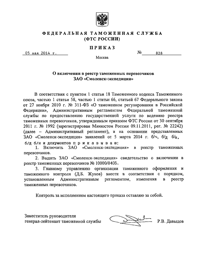 ПРИКАЗ ФТС РФ от 05.05.2014 N 828