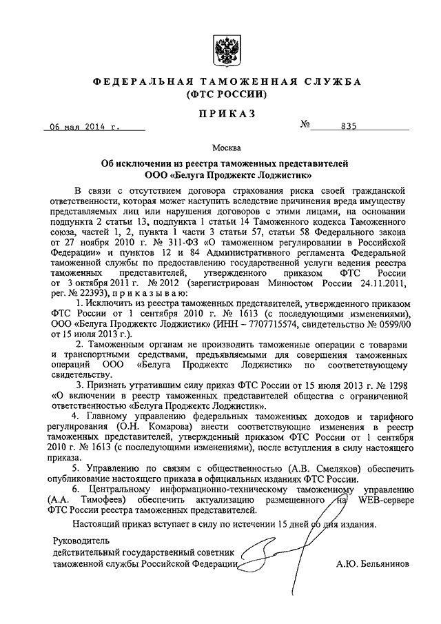 ПРИКАЗ ФТС РФ от 06.05.2014 N 835