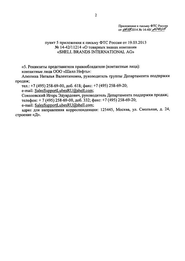 "О ВНЕСЕНИИ ИЗМЕНЕНИЙ В ПИСЬМО ФТС РОССИИ ОТ 19.03.2013 N 14-42/11214 "О ТОВАРНЫХ ЗНАКАХ КОМПАНИИ "SHELL BRANDS INTERNATIONAL AG"