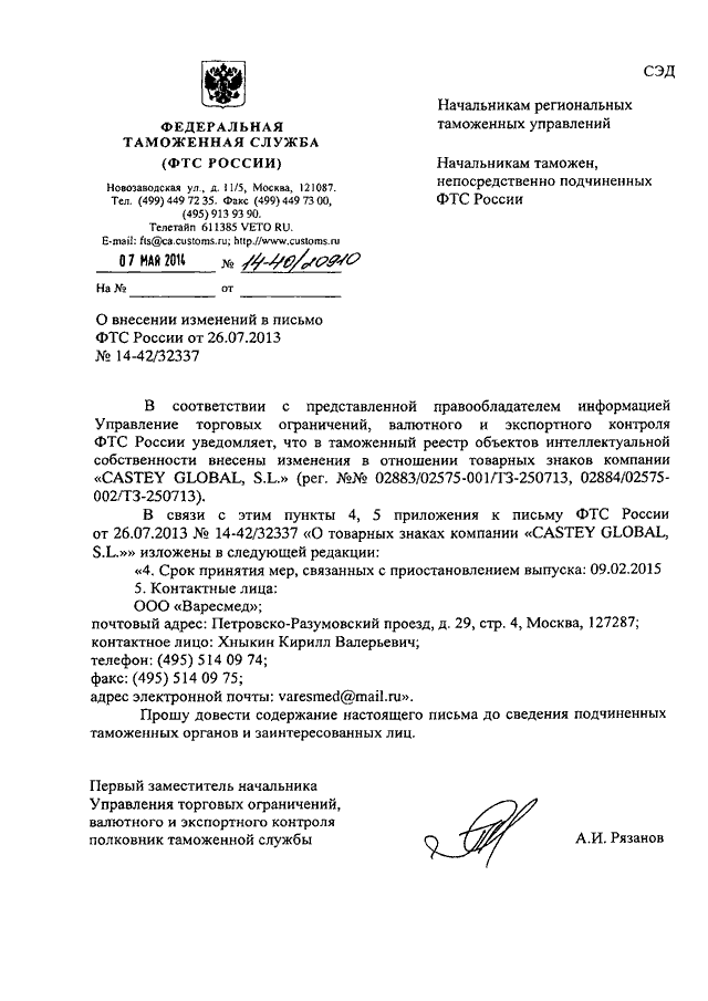 ПИСЬМО ФТС РФ от 07.05.2014 N 14-40/20910