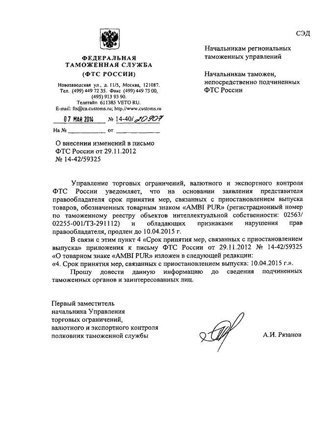 ПИСЬМО ФТС РФ от 07.05.2014 N 14-40/20907