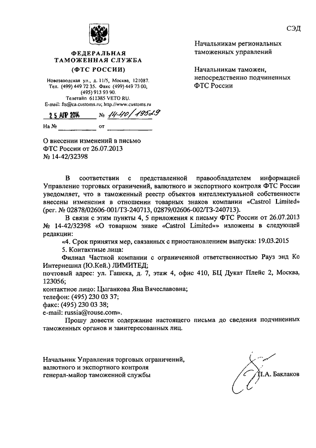 "О ВНЕСЕНИИ ИЗМЕНЕНИЙ В ПИСЬМО ФТС РОССИИ ОТ 26.07.2013 N 14-42/32398"