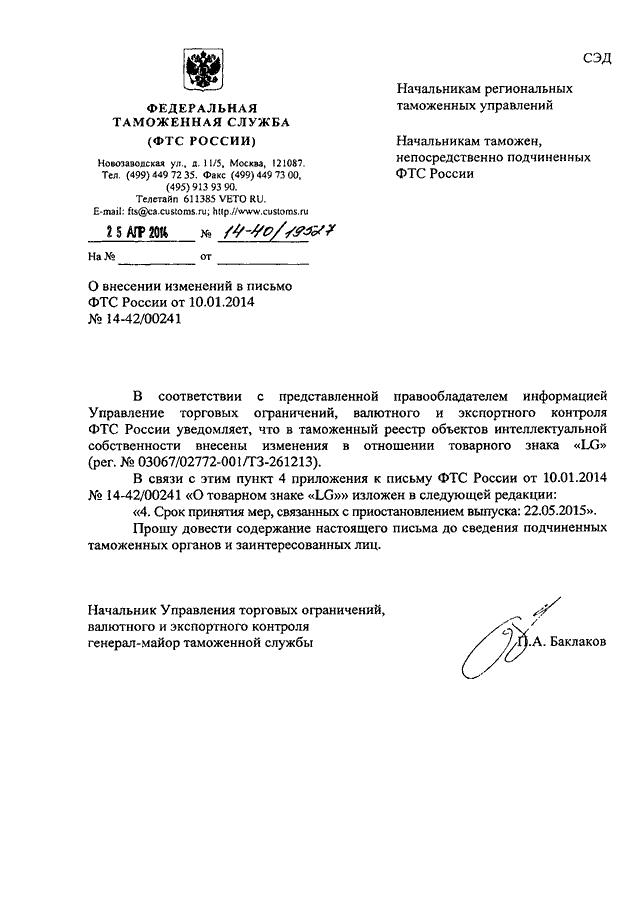 "О ВНЕСЕНИИ ИЗМЕНЕНИЙ В ПИСЬМО ФТС РОССИИ ОТ 10.01.2014 N 14-42/00241"