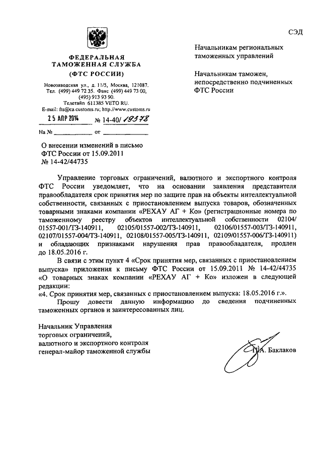 ПИСЬМО ФТС РФ от 25.04.2014 N 14-40/19378