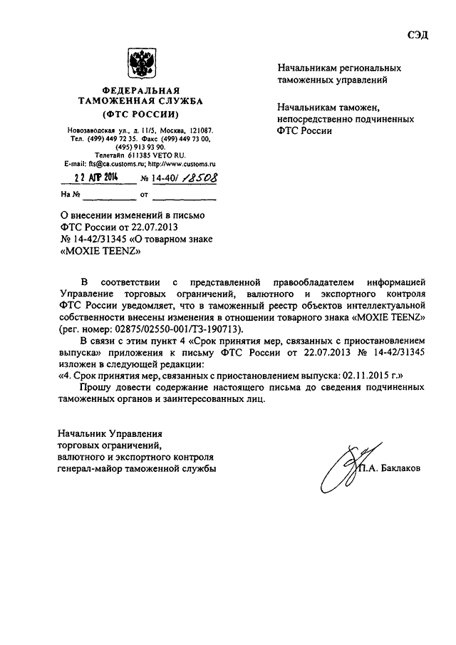 "О ВНЕСЕНИИ ИЗМЕНЕНИЙ В ПИСЬМО ФТС РОССИИ ОТ 22.07.2013 N 14-42/31345 "О ТОВАРНОМ ЗНАКЕ "MOXIE TEENZ"