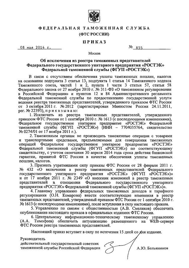 ПРИКАЗ ФТС РФ от 08.05.2014 N 855