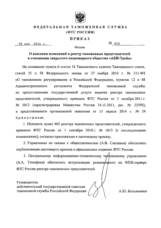ПРИКАЗ ФТС РФ от 08.05.2014 N 859