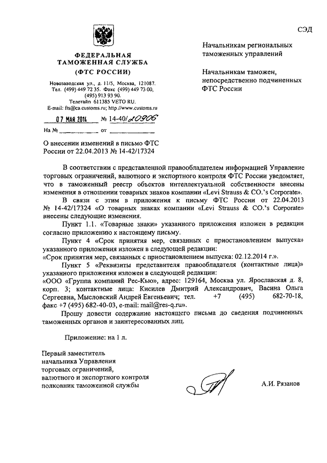 ПИСЬМО ФТС РФ от 07.05.2014 N 14-40/20906