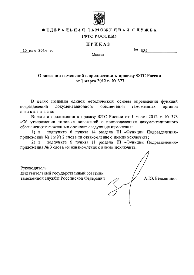 ПРИКАЗ ФТС РФ от 15.05.2014 N 884