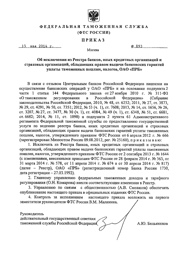 ПРИКАЗ ФТС РФ от 15.05.2014 N 893