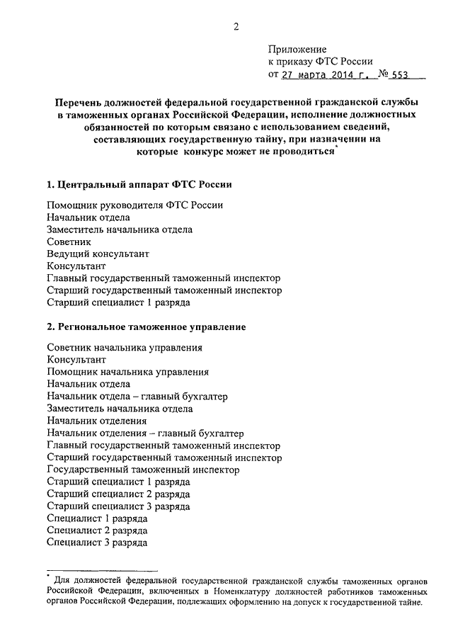 ПРИКАЗ ФТС РФ от 27.03.2014 N 553 "ОБ УТВЕРЖДЕНИИ ПЕРЕЧНЯ ДОЛЖНОСТЕЙ ФЕДЕРАЛЬНОЙ ГОСУДАРСТВЕННОЙ