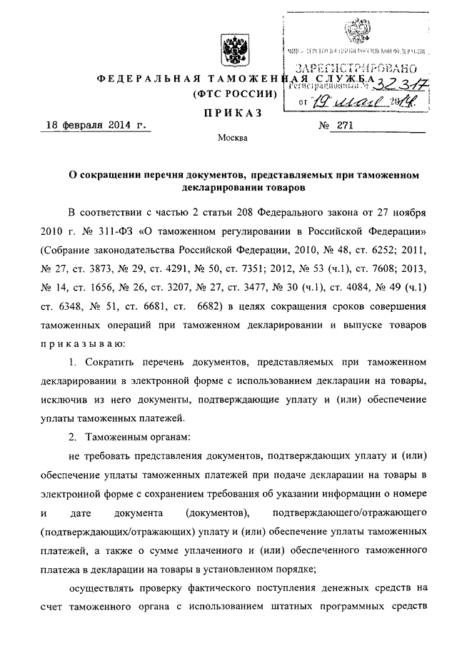 ПРИКАЗ ФТС РФ от 18.02.2014 N 271