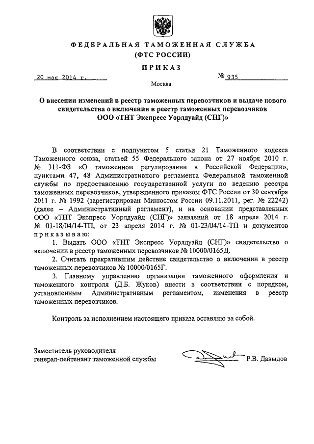 "О ВНЕСЕНИИ ИЗМЕНЕНИЙ В РЕЕСТР ТАМОЖЕННЫХ ПЕРЕВОЗЧИКОВ И ВЫДАЧЕ НОВОГО СВИДЕТЕЛЬСТВА О ВКЛЮЧЕНИИ В РЕЕСТР ТАМОЖЕННЫХ ПЕРЕВОЗЧИКОВ ООО "ТНТ ЭКСПРЕСС УОРЛДУАЙД (СНГ)"