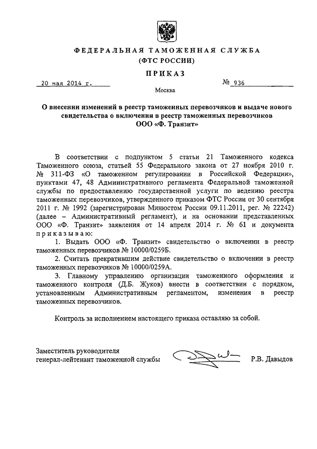 "О ВНЕСЕНИИ ИЗМЕНЕНИЙ В РЕЕСТР ТАМОЖЕННЫХ ПЕРЕВОЗЧИКОВ И ВЫДАЧЕ НОВОГО СВИДЕТЕЛЬСТВА О ВКЛЮЧЕНИИ В РЕЕСТР ТАМОЖЕННЫХ ПЕРЕВОЗЧИКОВ ООО "Ф. ТРАНЗИТ"