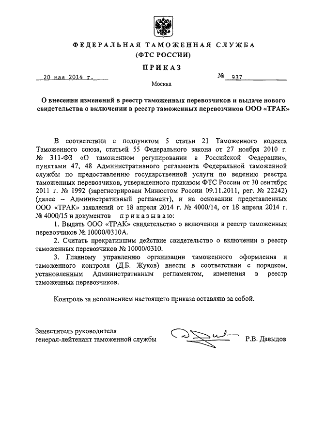 ПРИКАЗ ФТС РФ от 20.05.2014 N 937