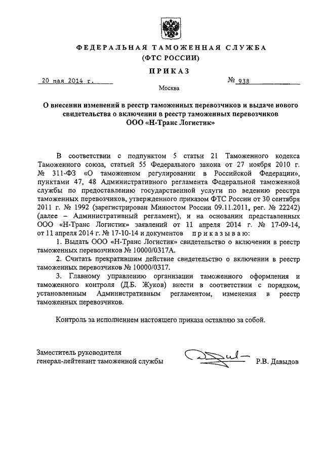 "О ВНЕСЕНИИ ИЗМЕНЕНИЙ В РЕЕСТР ТАМОЖЕННЫХ ПЕРЕВОЗЧИКОВ И ВЫДАЧЕ НОВОГО СВИДЕТЕЛЬСТВА О ВКЛЮЧЕНИИ В РЕЕСТР ТАМОЖЕННЫХ ПЕРЕВОЗЧИКОВ ООО "Н-ТРАНС ЛОГИСТИК"