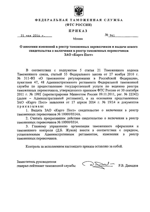 "О ВНЕСЕНИИ ИЗМЕНЕНИЙ В РЕЕСТР ТАМОЖЕННЫХ ПЕРЕВОЗЧИКОВ И ВЫДАЧЕ НОВОГО СВИДЕТЕЛЬСТВА О ВКЛЮЧЕНИИ В РЕЕСТР ТАМОЖЕННЫХ ПЕРЕВОЗЧИКОВ ЗАО "КАРГО ПОСТ"